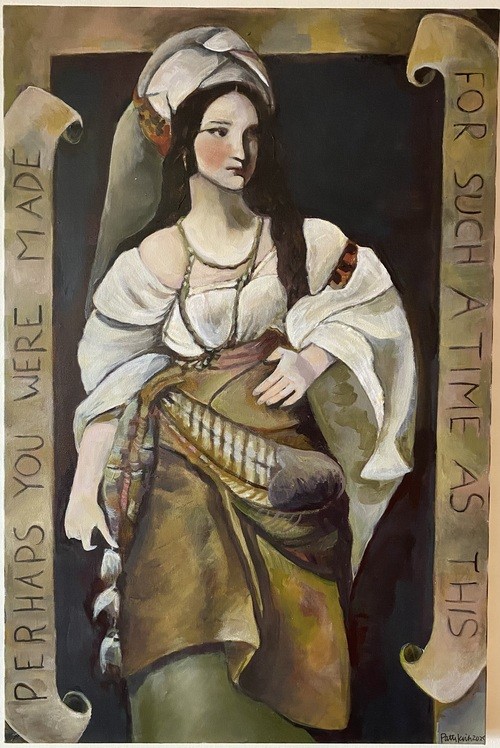 The Launers were founding members of Westminster who worked tirelessly to ground the congregation in 1964 and nurtured her in the six decades following. Patty had already been envisioning a portrait of Queen Esther, whose courageous faithfulness had saved her fellow Jewish people from destruction. The often-quoted passage, "And who knows whether you have not come to the kingdom for such a time as this?" (Esther 4:14) spoke to Esther in her day and situation, to the Launers and Lehans in their faith journeys, and to all of us as we seek the courage to follow where God is leading.