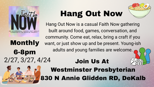 Faith Now is a nondenominational Christian fellowship group for twenty-somethings to forty- somethings - "to grow in faith, build friendships, ask big questions, and find belonging". We will meet for a "Hang Out Now" at Westminster monthly on Friday nights from 6:00-8:00. Please join us for an evening of food and fellowship. See Faith Now DeKalb on Facebook for details.